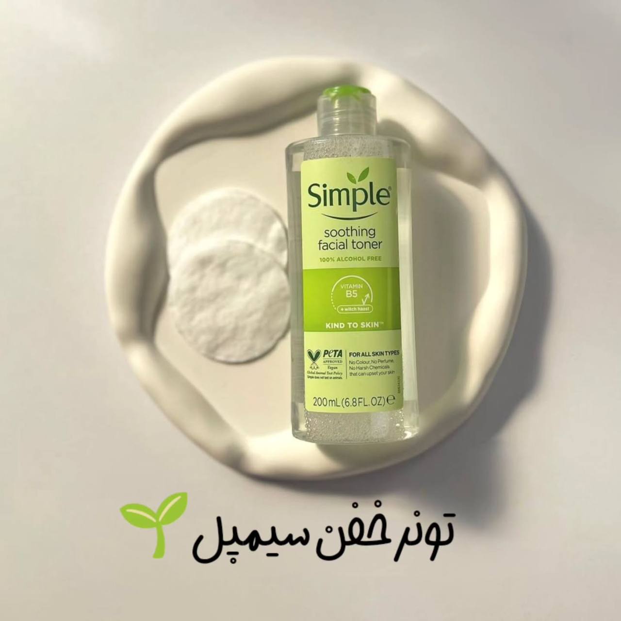 نحوه استفاده تونر سیمپل برای نتیجه گیری بهتر از استفاده تونر سیمپل مدل kind to skin کافی است بعد از استفاده یک شوینده مناسب، مقدار کافی از آن را روی پد ریخته و به طور کامل صورت خود را با استفاده از آن پاکسازی نمایید. • مناسب انواع پوست حتی حساس و چرب • حجم: 200 میل