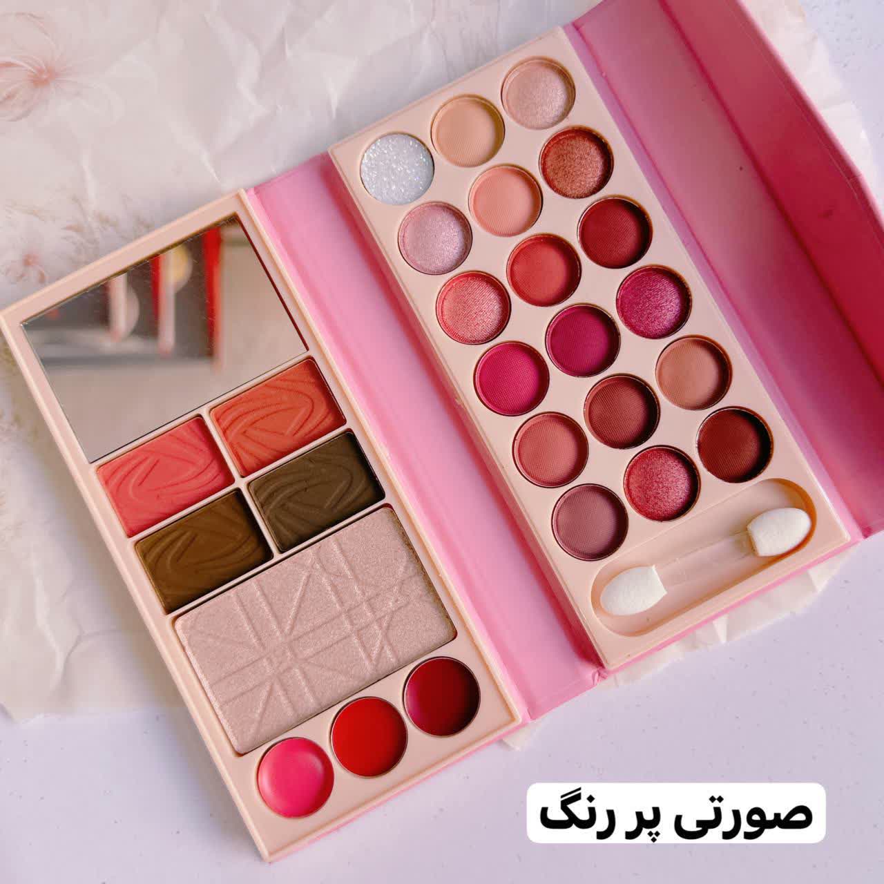 دارای 18 رنگ سایه شاین و مات هایلایتر سایه ابرو رژگونه 3 رنگ رژ لب پد سایه اینه بصورت کیفی بسته میشه و محتویات پالت نمیریزه