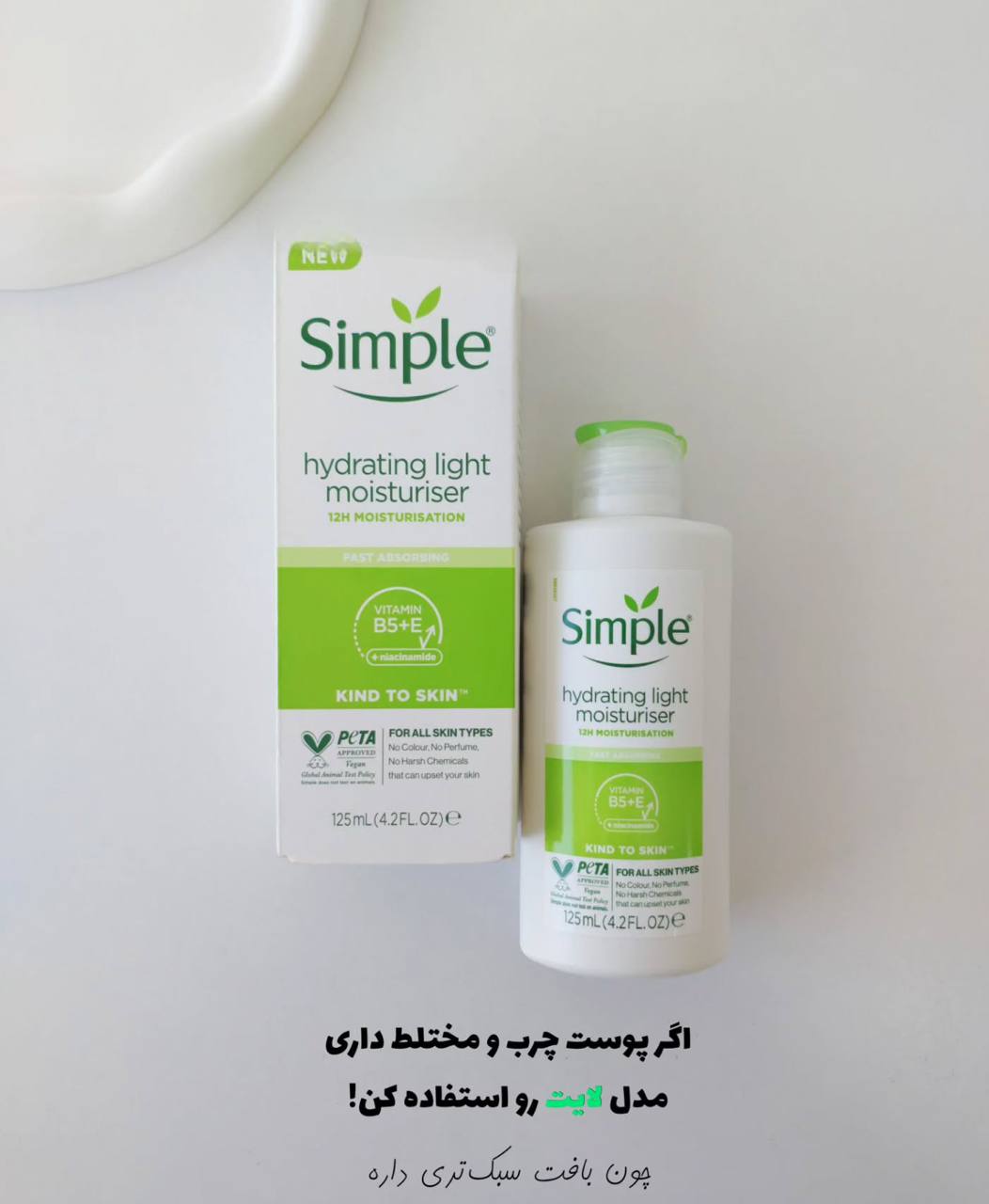 اصلی SIMPLE PROTECTING LIGHT MOISTURIZERS SPF15 • آبرسان پوست • کرم آبرسان سیمپل • حاوی ویتامین E و B5 • حاوی روغن دانه گل گاوزبان • ضد التهاب و آنتی باکتریال • بهبود کارکرد رنگدانه های پوستی • حاوی پروویتامین ها و آنتی اکسیدان های ضروری پوست • دارای SPF : 15 • فاقد الکل و پارابن • وگان (Vegan) • فاقد خشونت و تست حیوانی (Cruelty-Free) • حجم : 125 ml
